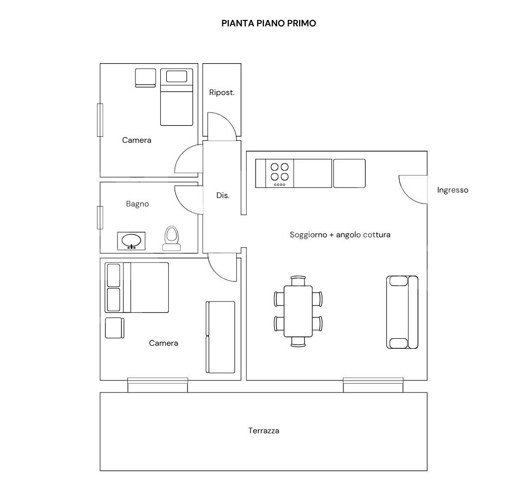 L'appartamento si sviluppa con ingresso sul soggiorno con cucina ad angolo cottura e ampio terrazzo perfetto per momenti all'aria aperta, disimpegno che porta a due camere da letto, un bagno finestrato e un comodo ripostiglio, che volendo si può adibire a secondo bagno.