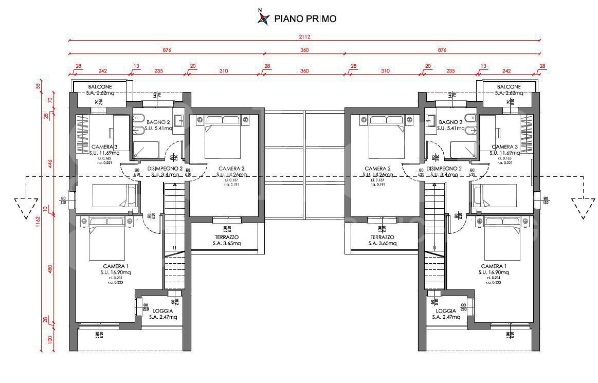 - Tre camere da letto, a cui sono abbinati rispettivamente una loggia, un balcone e un terrazzo