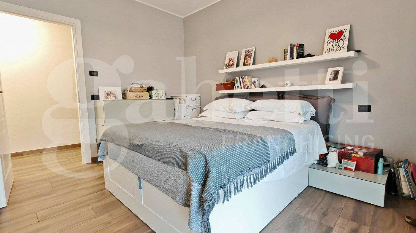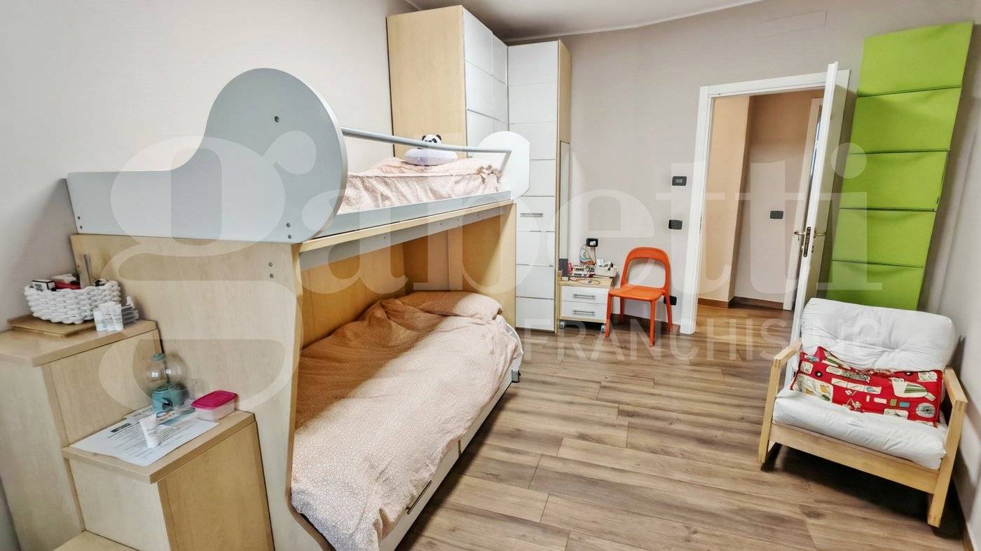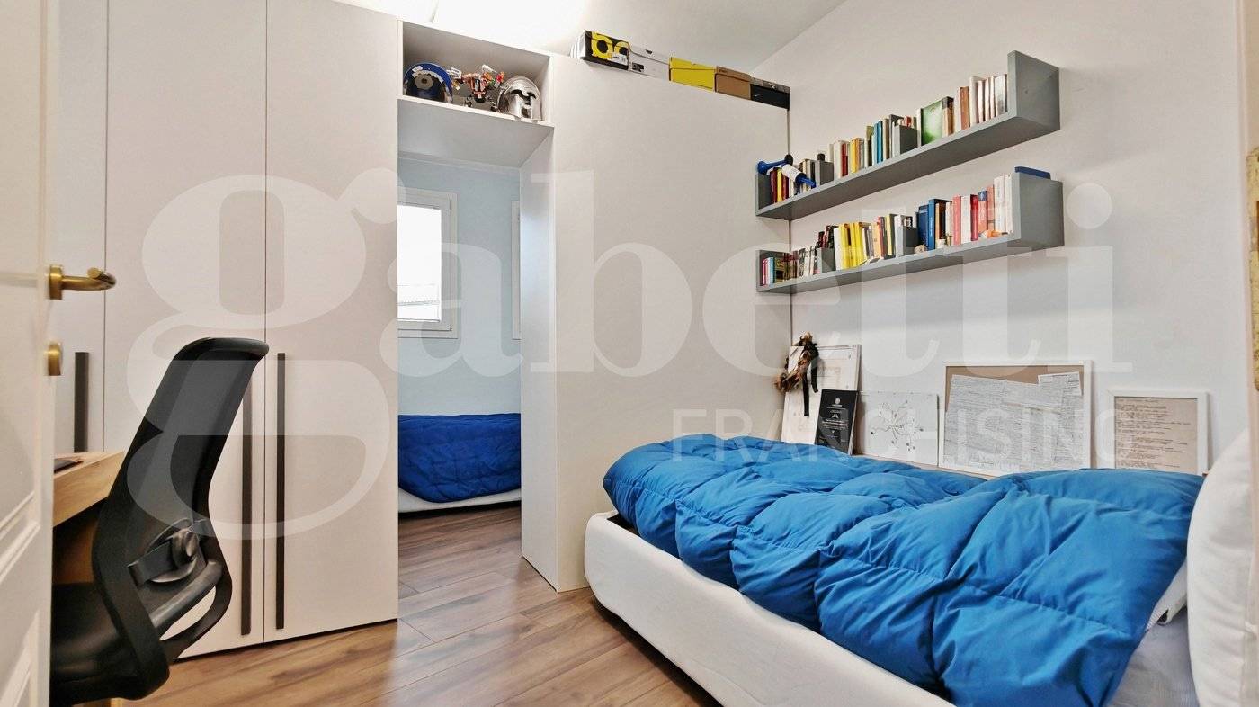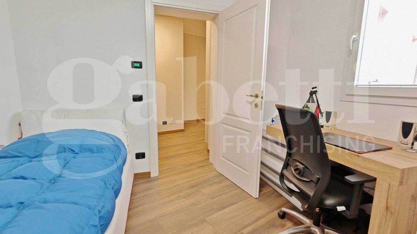 La zona notte ospita tre camere da letto e due bagni. Una delle camere, di dimensioni particolarmente generose, è organizzata con una soluzione d'arredo su misura con un armadio divisorio che crea due ambienti comunicanti e ben separati, permettendo una gestione pratica e riservata degli spazi per due persone.