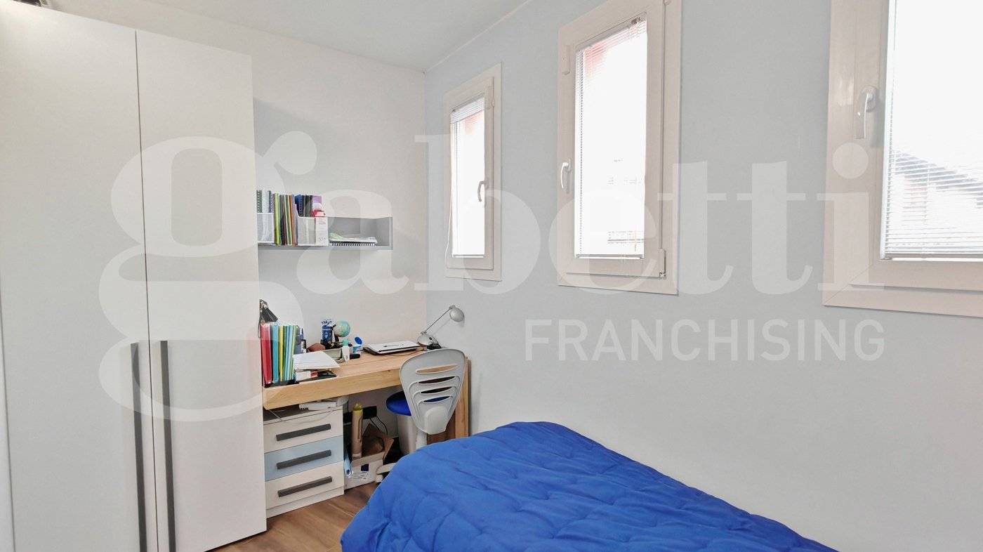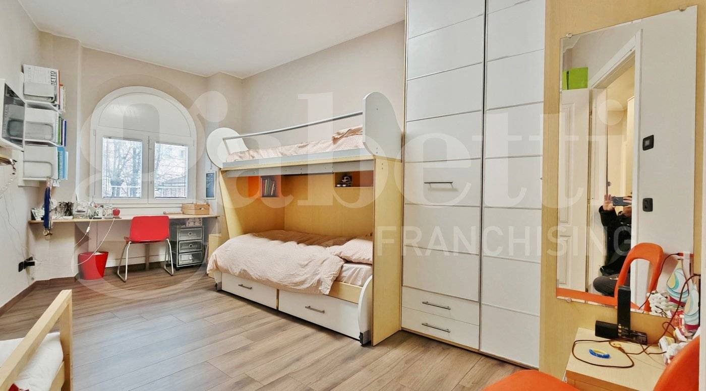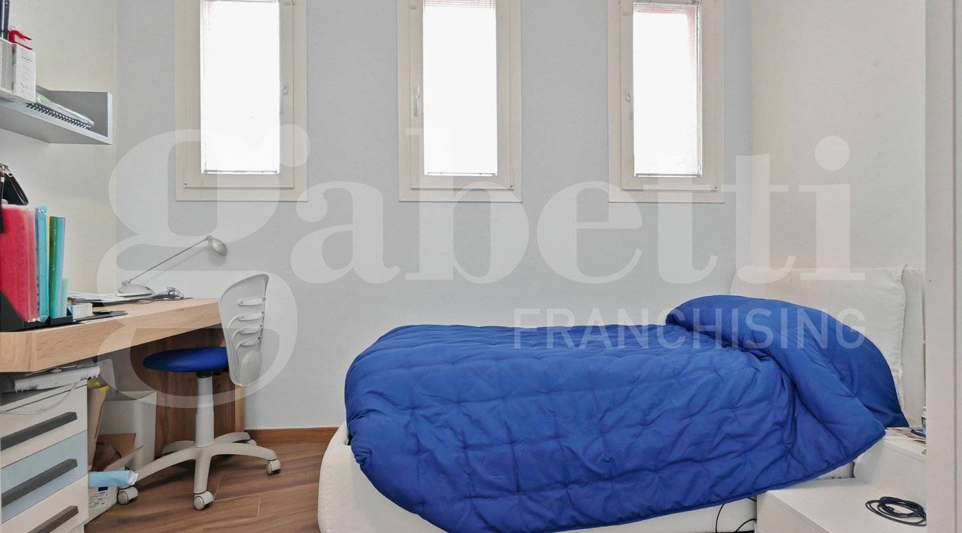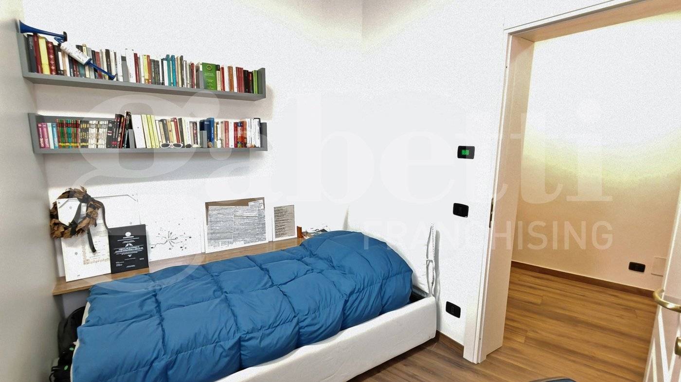 La zona notte ospita tre camere da letto e due bagni. Una delle camere, di dimensioni particolarmente generose, è organizzata con una soluzione d'arredo su misura con un armadio divisorio che crea due ambienti comunicanti e ben separati, permettendo una gestione pratica e riservata degli spazi per due persone.